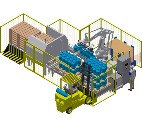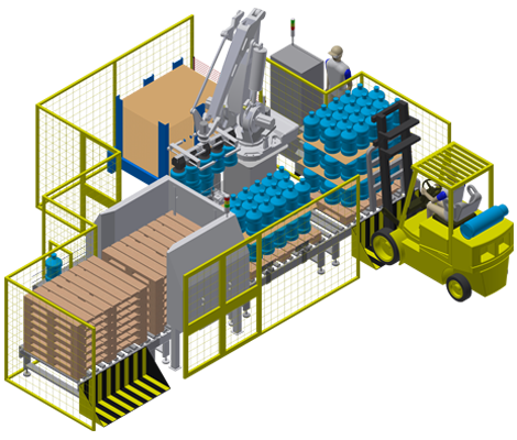 Flexibility industrial articulated robotic to handle palletizing system of gallon. With a range of add-ons, this gallon palletizer can be very economical to fully automize and safety with laser curtain.